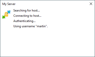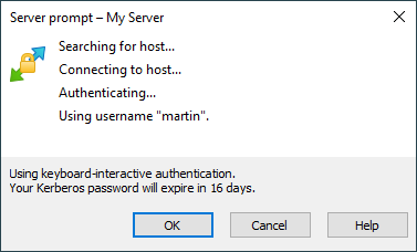 During authentication WinSCP will present you with authentication window to show you progress of authentication and to prompt you to enter your credentials or other information.